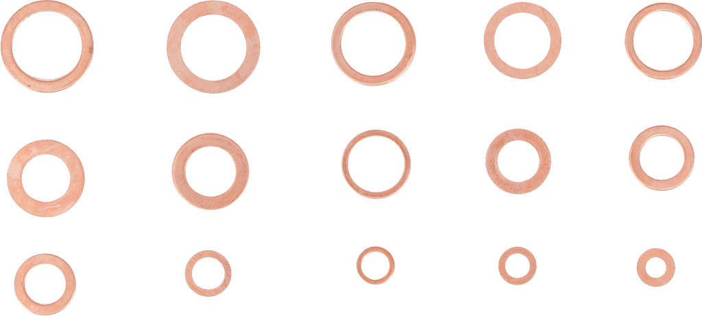 Tömítőgyűrű-készlet Vörösréz, 150 darabos. Szortimentdobozban. Falikárpithoz alkalmas csomagolás: Igen. Termékleírás: Olajleeresztő csavarok. Szállítási terjedelem: 15 különböző méret, egyenként 10 darab (belső Ø 5 mm–17,5 mm, különböző külső Ø és vastagságok a csomagolás szerint).