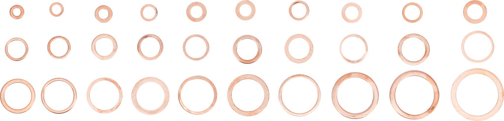 Tömítőgyűrű-készlet, vörösréz, 300 darabos, szortimentdobozban. Szállítási terjedelem: 30 méret, egyenként 10 db — Ø5×9 mm (1,0 mm), Ø6×10 (1,0), Ø6×12 (1,0), Ø8×12 (1,0), Ø8×14 (1,0), Ø8×14 (1,5), Ø9×14 (1,0), Ø10×14 (1,0), Ø10×14 (1,5), Ø10×16 (1,0), Ø12×16 (1,0), Ø12×16 (1,5), Ø12×18 (1,5), Ø13×18 (1,0), Ø14×18 (1,5), Ø14×20 (1,5), Ø14×20 (2,0), Ø16×20 (1,5), Ø16×22 (1,5), Ø18×22 (1,5), Ø18×24 (1,5), Ø20×24,5 (1,5), Ø20×24,5 (0,8), Ø19×26 (2,0), Ø22×27 (1,5), Ø22×29 (1,5), Ø24×29 (1,5), Ø24×32 (2,0), Ø26×34 (2,0), Ø28×36 (2,0).
