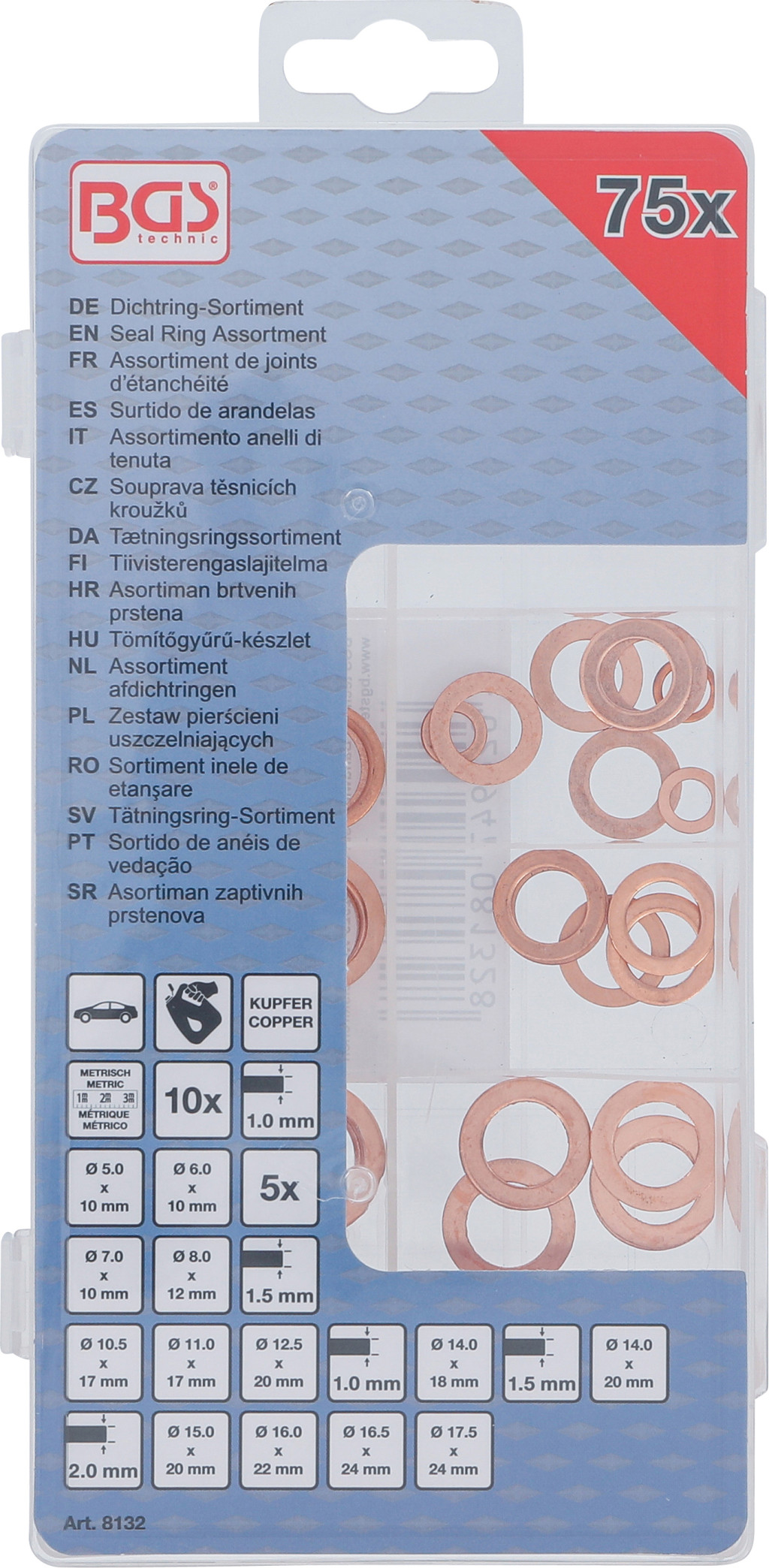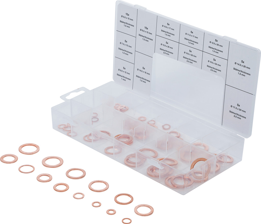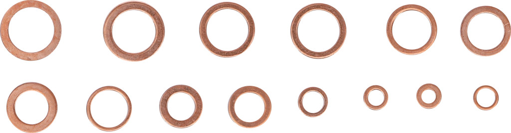 Tömítőgyűrű-készlet vörösrézből, 75 darab, metrikus kivitel olajleeresztő csavarokhoz. Újra felhasználható univerzális dobozban.\n\nSzállítási terjedelem: vörösréz tömítőgyűrű Ø 5,0 x 10 mm, vastagság 1,0 mm; Ø 6,0 x 10 mm, vastagság 1,0 mm; Ø 7,0 x 10 mm, vastagság 1,0 mm; Ø 8,0 x 12 mm, vastagság 1,0 mm; Ø 10,5 x 17 mm, vastagság 1,5 mm; Ø 11,0 x 17 mm, vastagság 1,5 mm; Ø 12,5 x 20 mm, vastagság 1,5 mm; Ø 14,0 x 18 mm, vastagság 1,0 mm; Ø 14,0 x 20 mm, vastagság 1,5 mm; Ø 15,0 x 20 mm, vastagság 2,0 mm; Ø 16,0 x 22 mm, vastagság 2,0 mm; Ø 16,5 x 24 mm, vastagság 2,0 mm; Ø 17,5 x 24 mm, vastagság 2,0 mm.