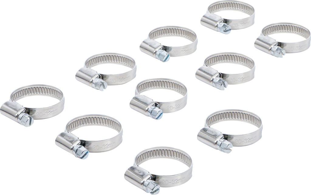 Tömlőbilincs INOX 20–32 mm, 9 mm széles, 10 db; csomagolás falikárpithoz és BGS 8095 bemutatóállványhoz alkalmas.