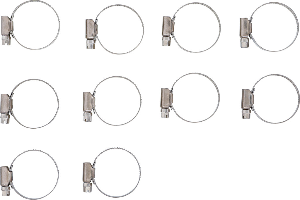INOX tömlőbilincs 25–40 mm, 9 mm széles bilincsszalag, 10 darabos csomag, falikárpitra alkalmas csomagolás; kompatibilis BGS 8095 bemutató állványhoz.