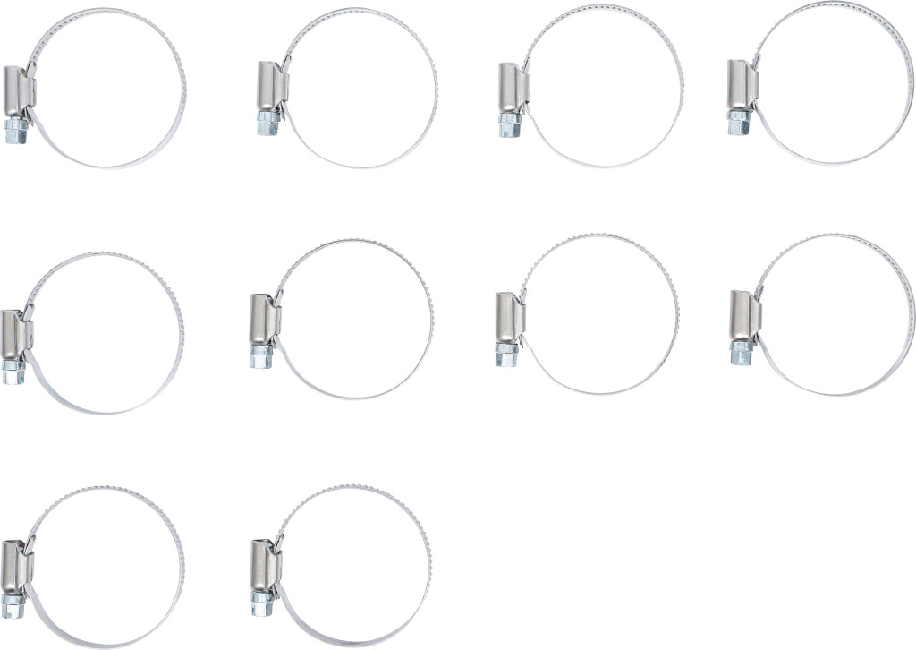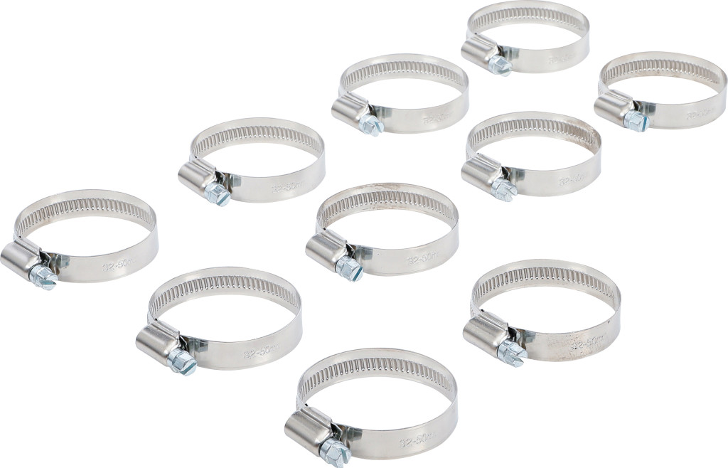 Tömlőbilincs INOX 32–50 mm, 12 mm széles, 10 darabos csomag, falikárpithoz alkalmas csomagolás, BGS 8095 bemutatóállványhoz