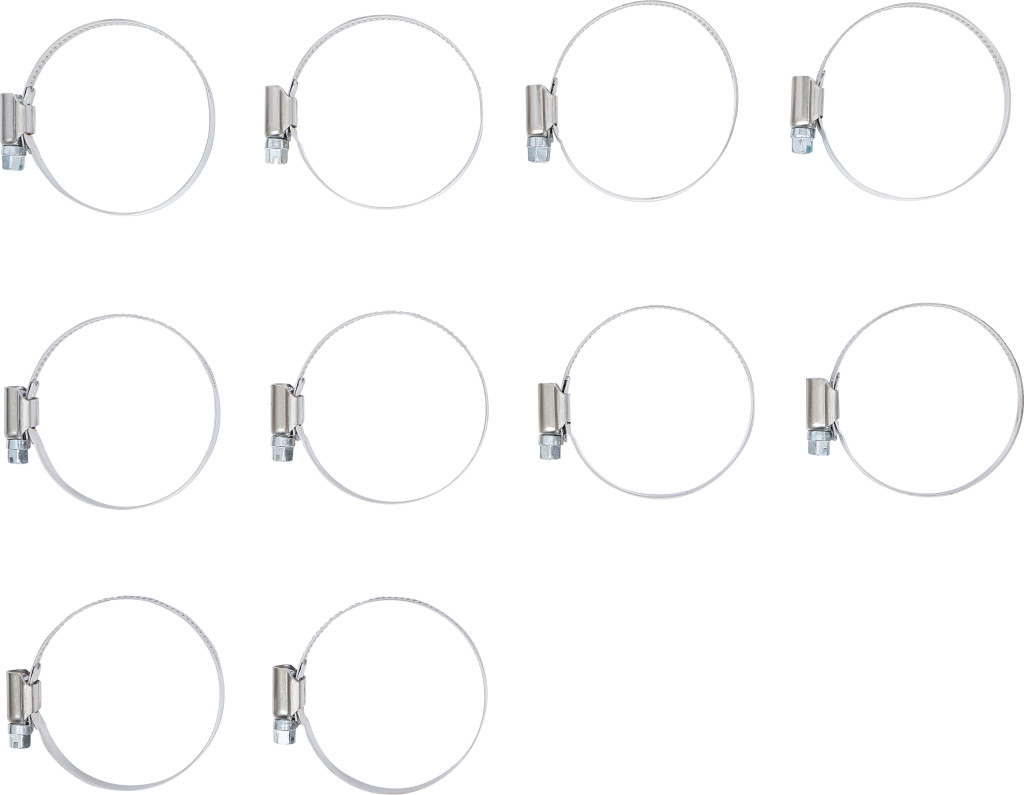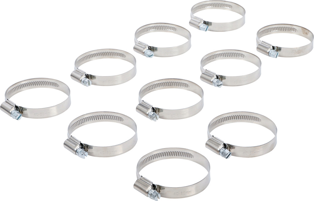 Tömlőbilincs INOX 40–60 mm, 12 mm széles, 10 darabos csomag; falikárpithoz alkalmas csomagolás; BGS 8095 bemutatóállványhoz.