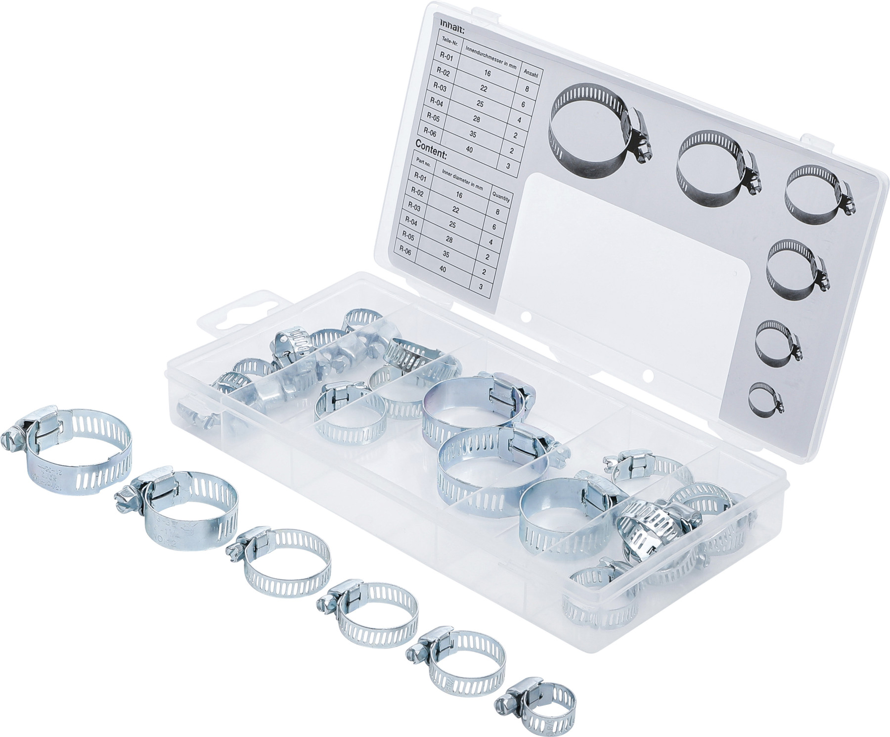 Tömlőbilincs-készlet, 25 darabos, szortimentdobozban. A csomagolás falikárpitra alkalmas. Szállítási terjedelem: 8 × Ø 16 mm, 6 × Ø 22 mm, 4 × Ø 25 mm, 2 × Ø 28 mm, 2 × Ø 35 mm és 3 × Ø 40 mm tömlőbilincs. A bilincsek a szortimentdobozban rendezetten, könnyen átláthatóan találhatók.