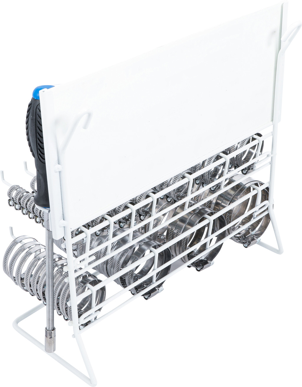 Rozsdamentes 111 részes tömlőbilincs-készlet INOX táblán, falra szerelhető tartóállvánnyal; 10-10 bilincs 9 mm és 12 mm szélességben különböző átmérőkhöz, 7 mm-es hatszögletű csavarhúzóval.