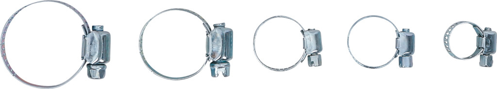 26 darabos tömlőbilincs-készlet, szortimentdobozban. Szállítási terjedelem: 8 db Ø 16 mm, 6 db Ø 22 mm, 4 db Ø 25 mm, 2 db Ø 28 mm, 2 db Ø 35 mm és 4 db Ø 40 mm tömlőbilincs. A csomagolás falikártyához alkalmas.