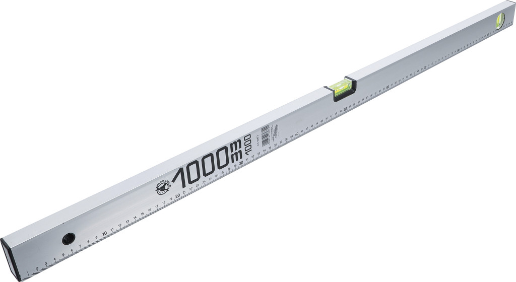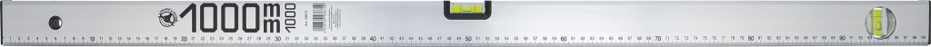1000 mm alumínium vízmérték vízszintes és függőleges libellával, 1 mm-es beosztással, maratott alsó oldallal és felfüggesztő furattal; pontosság 0,75 mm/m.