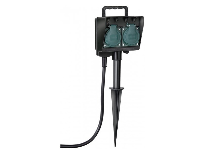 Brennenstuhl 2-es kerti konnektor / kültéri konnektor (fekete) Kerti aljzat földelő tüskével Állandó kültéri használatra, kerti lámpák, tündérfények, rádió, elektromos grill stb. csatlakoztatására A tüske és a ház erős, időjárásálló műanyagból készült és fröccsenésálló, IP44 Kültéri konnektor neoprén gumi csatlakozókábellel és földelő érintkező dugóval Önzáró csukható fedéllel Műszaki adatok Dugó: 230 V/ 16 A Aljzatok: 2 x 230 V/ 16 A Kábelmegnevezése: H07RN-F 3G1,5 Kábelhossz: 1,40 m Kábelminőség: Gumi-neoprén Max. áram-terhelhetőség: 16 A Méret: 6,5 x 12 x 38 cm Tömeg: 0,59 kg Szállítási terjedelem: 1 x kültéri konnektor önzáró csukható fedéllel