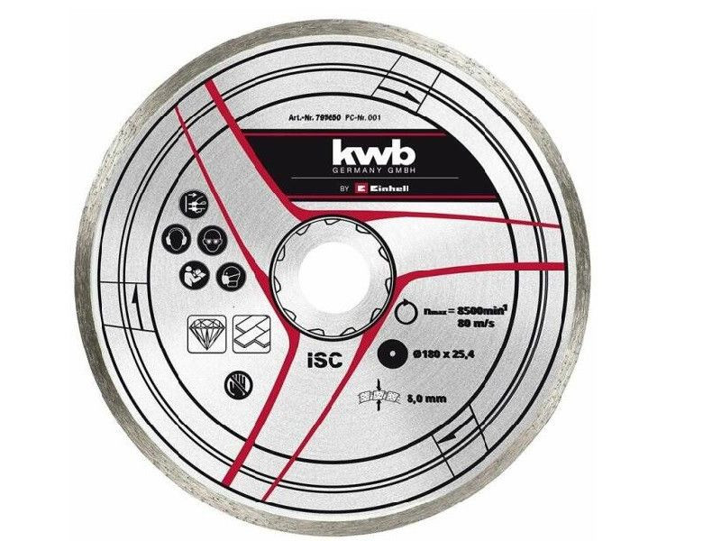 Csempe, porcelán vágásához, zárt, gyémántbevonatú vágóél. 4 mm vágási felületi mélység. 2,4 mm vékony vágótárcsa a precíz vágásokhoz. Maximális fordulatszám: 8500 rpm