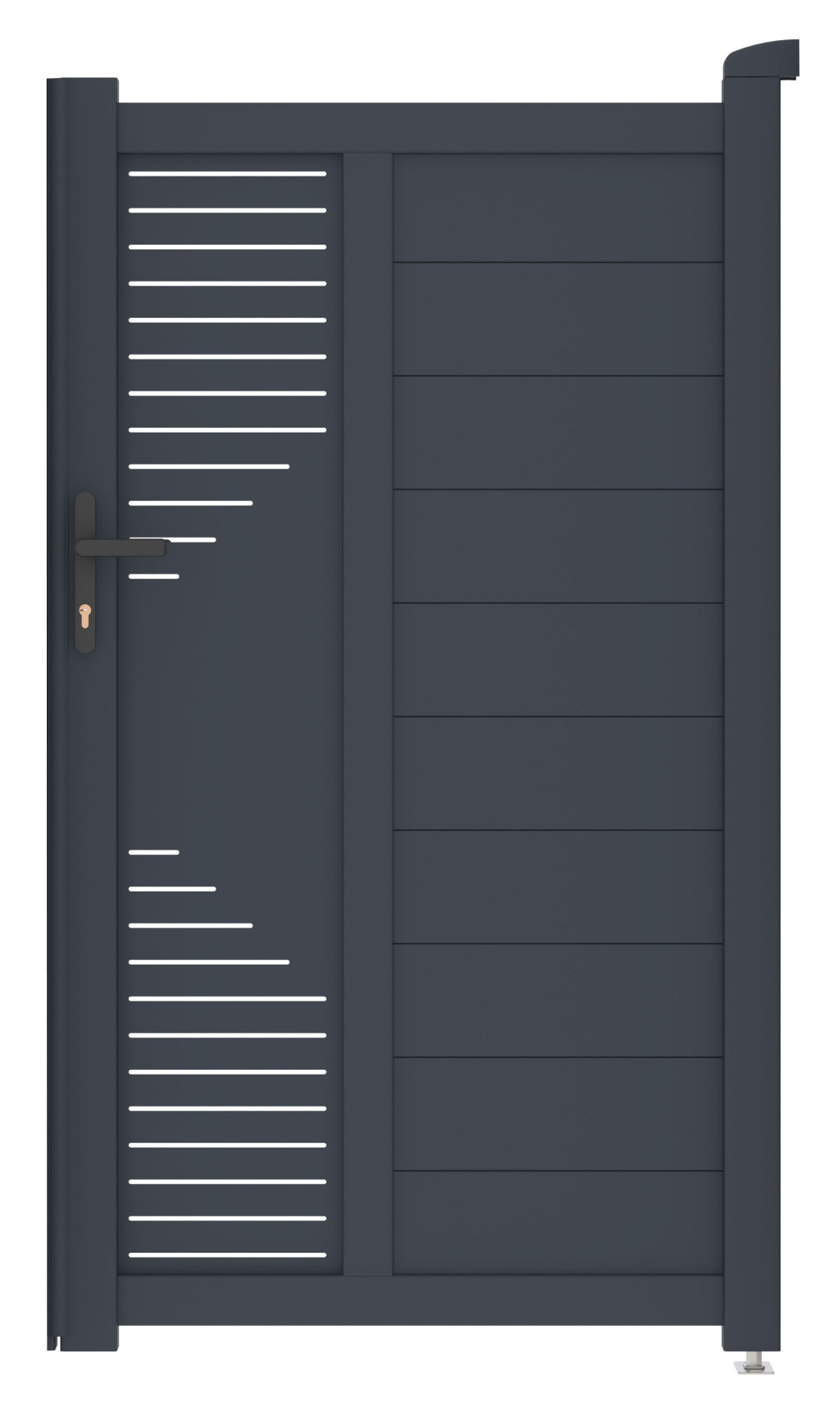 A vízszintesen elhelyezett lécekkel való kitöltés előnyei közé tartozik, hogy modern dizájnt és megfelelő magánéletet biztosít, így a kapu bármilyen bekerített telekhez illeszkedik. A dekoratív CNC panel vonzóbbá teszi a kaput.