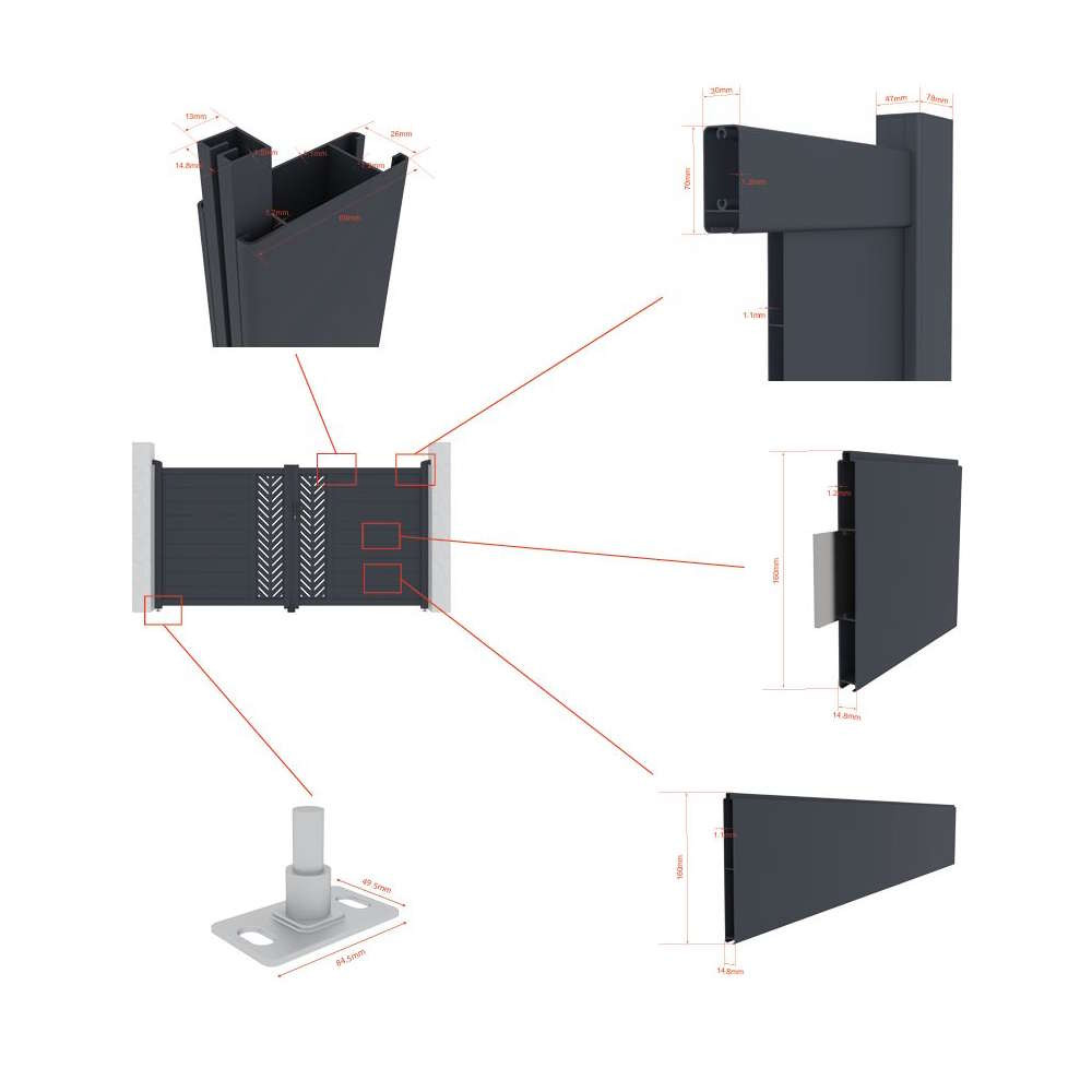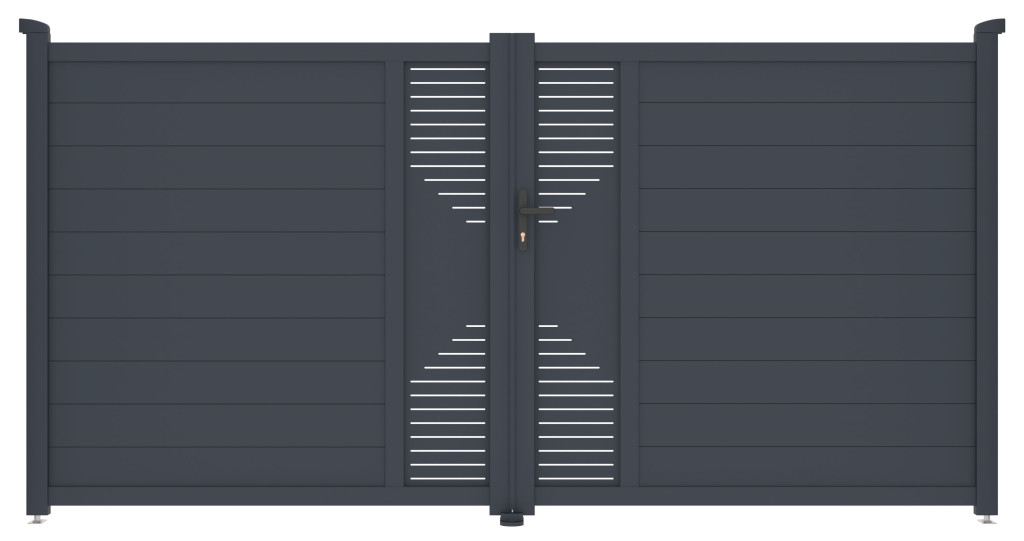 A Marion kétszárnyú bejárati kapu megbízható és karbantartást nem igénylő alumíniumból készült. Repedésnek és hajlításnak ellenáll, nem rozsdásodik, és porszórt bevonata antracit árnyalatban tetszetősséget és színtartósságot biztosít. A megerősített profil lehetővé teszi elektromos nyílás beépítését a jövőben.