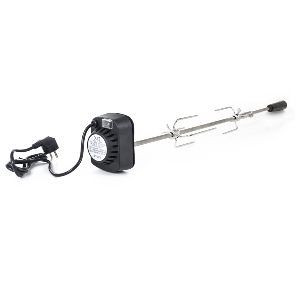Az egyik oldalon levehető műanyag tartó található, amelyen egy praktikus szem van a rögzítéshez. A másik oldalon a műanyag tokban elhelyezett motor található, amelyen a ki-/bekapcsolás gomb is megtalálható. A 230 V teljesítményű motort egyszerűen csatlakoztathatja az áramkörre a kb. 125 cm hosszú kábel segítségével. A motoros nyárs gyorsasága 2 fordulat/perc, ami biztosítja, hogy az étel ne égjen le és egyenletesen süljön.