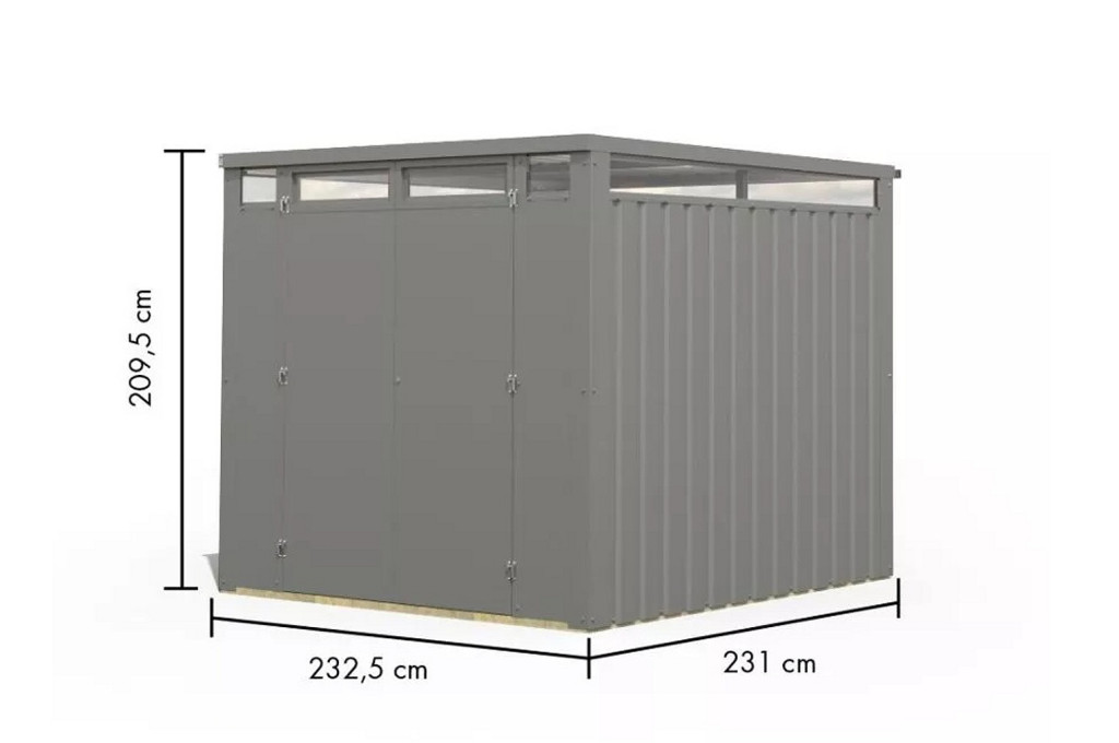 Fém kerti ház, sz 232 x h 231 x ma 210 cm, szürke színű.