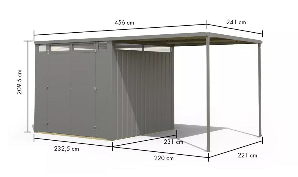 A horganyzott acél négyzetcső váz robusztus felépítése ellenáll a szélnek és az időjárásnak, míg a teljes hosszúságú mesterséges üveg fénycsík természetes belső megvilágítást és kellemes hangulatot teremt. A szállítás egy kiváló minőségű ereszcsatornát tartalmaz, amely hatékonyan vezeti el a vizet.