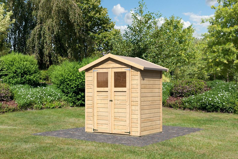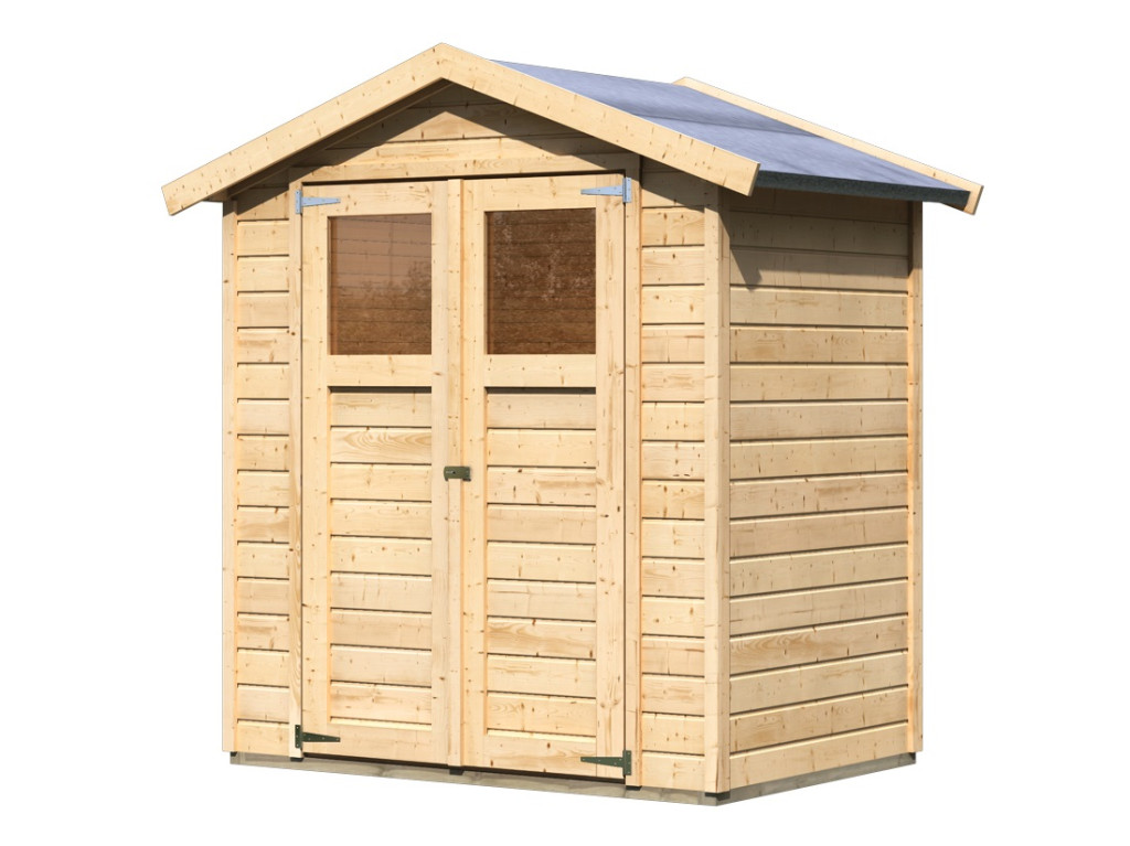 Egy faház alapmodellje kertjébe. Ez a modell nyeregtetővel és dupla csuklós ajtókkal rendelkezik, mindkét szárnyban ablakkal.