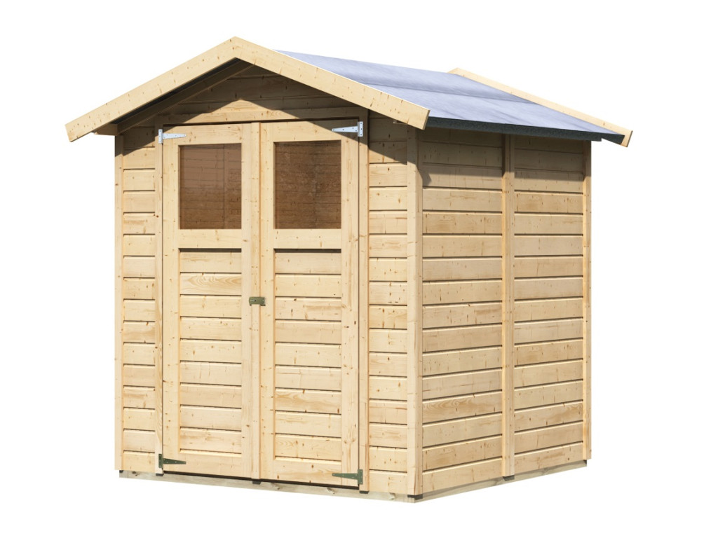 Ez a modell nyeregtetővel és dupla csuklós ajtókkal rendelkezik, mindkét szárnyban ablakkal.