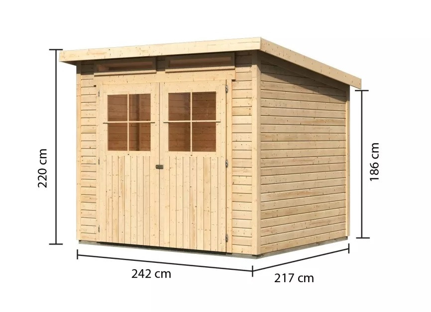 Ez a modell lapos tetővel és dupla csuklós ajtókkal rendelkezik, mindkét szárnyban ablakkal. A ház építőanyaga 19 mm vastagságú, északi lucfenyőből tökéletesen mart faprofil. Bontott állapotban készletben szállítjuk, ahol a falak egyedi faprofilokból állnak, amelyeket egyszerűen össze kell rakni és összecsavarozni, a tető egyetlen deszkából. Ez rendkívül egyszerű összeszerelést garantál, amelyet minden ezermester el tud végezni.