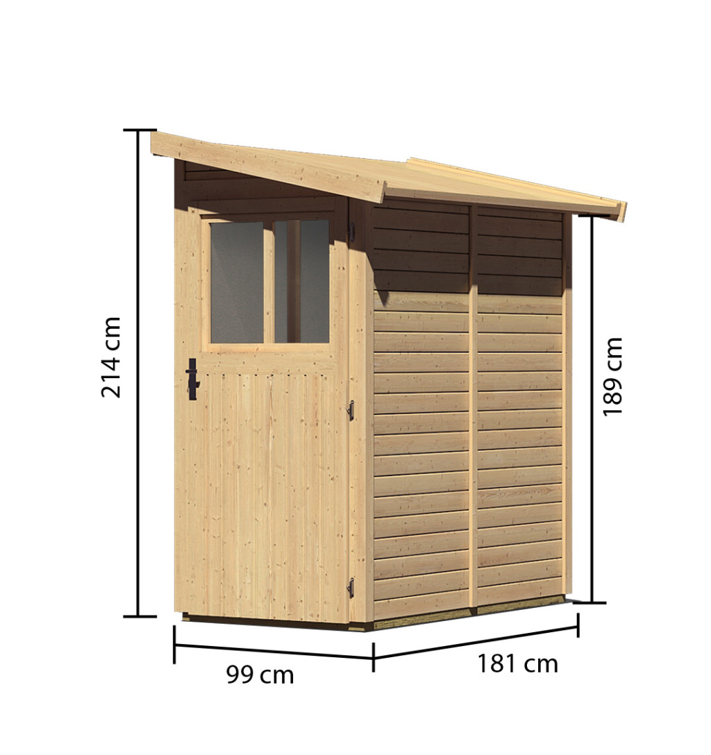 Fából készült kerti ház, lucfenyőből, ferde tetővel, külső méretek sz 180 x me 93 cm.