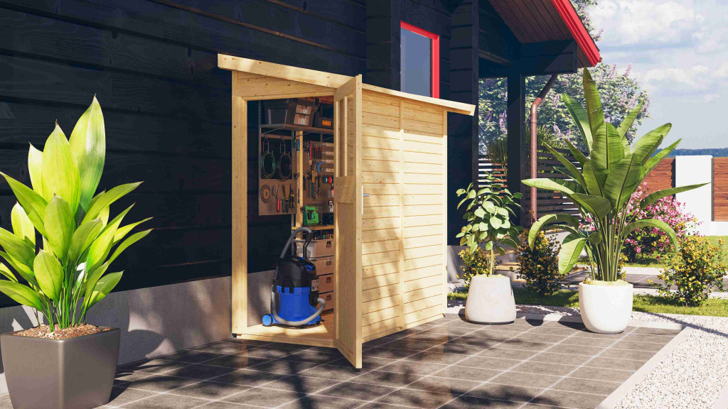 Faház a fal mellett. A házban kerti felszereléseket, szerszámokat tárolhat, vagy barkácsműhelyt építhet.