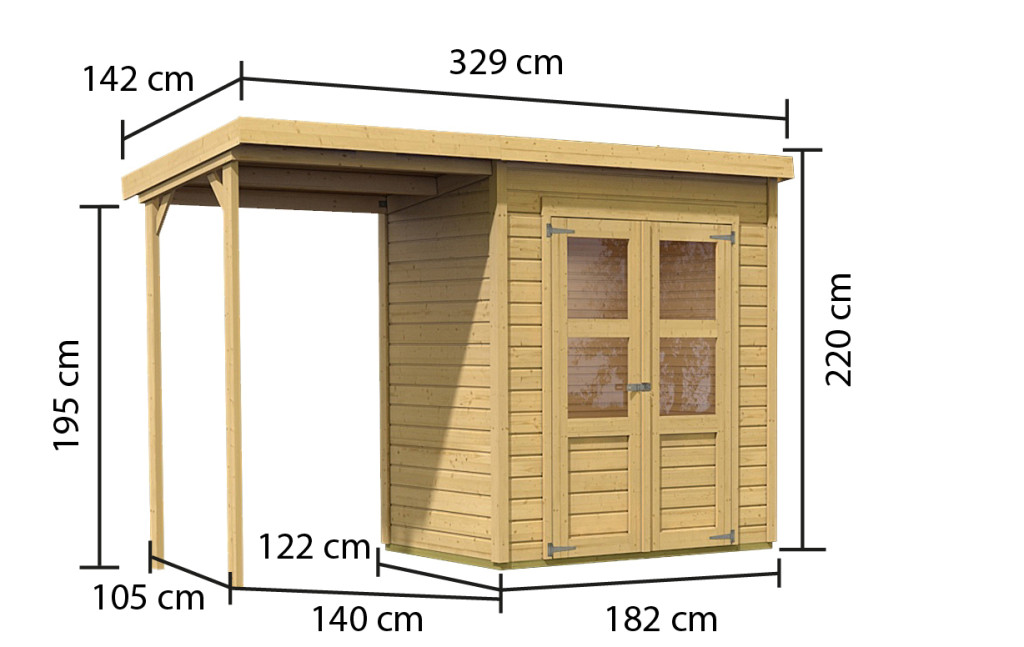 Egy faház alapmodellje kertjébe. Ez a modell lapos tetővel és dupla csuklós ajtókkal rendelkezik, mindkét szárnyban ablakkal.