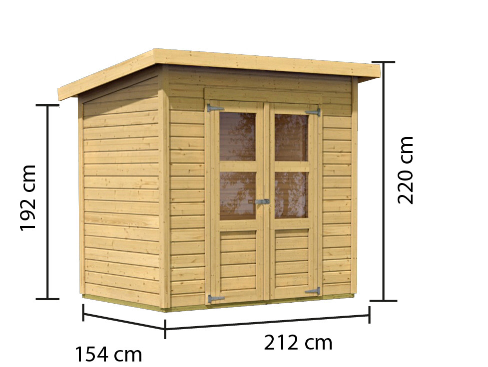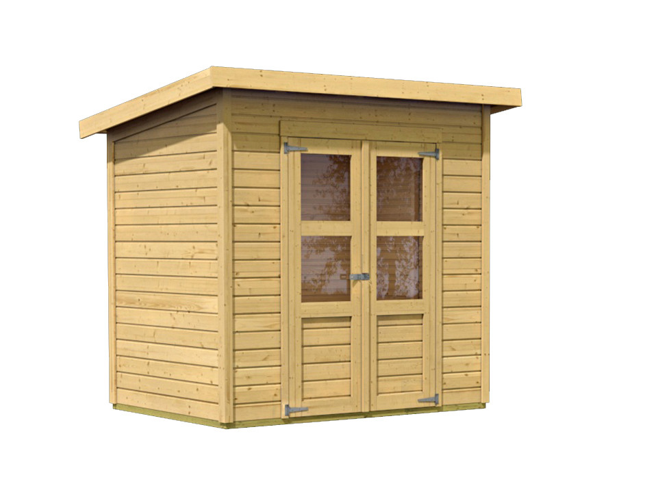 Egy faház alapmodellje kertjébe. Ez a modell lapos tetővel és dupla csuklós ajtókkal rendelkezik, mindkét szárnyban ablakkal.