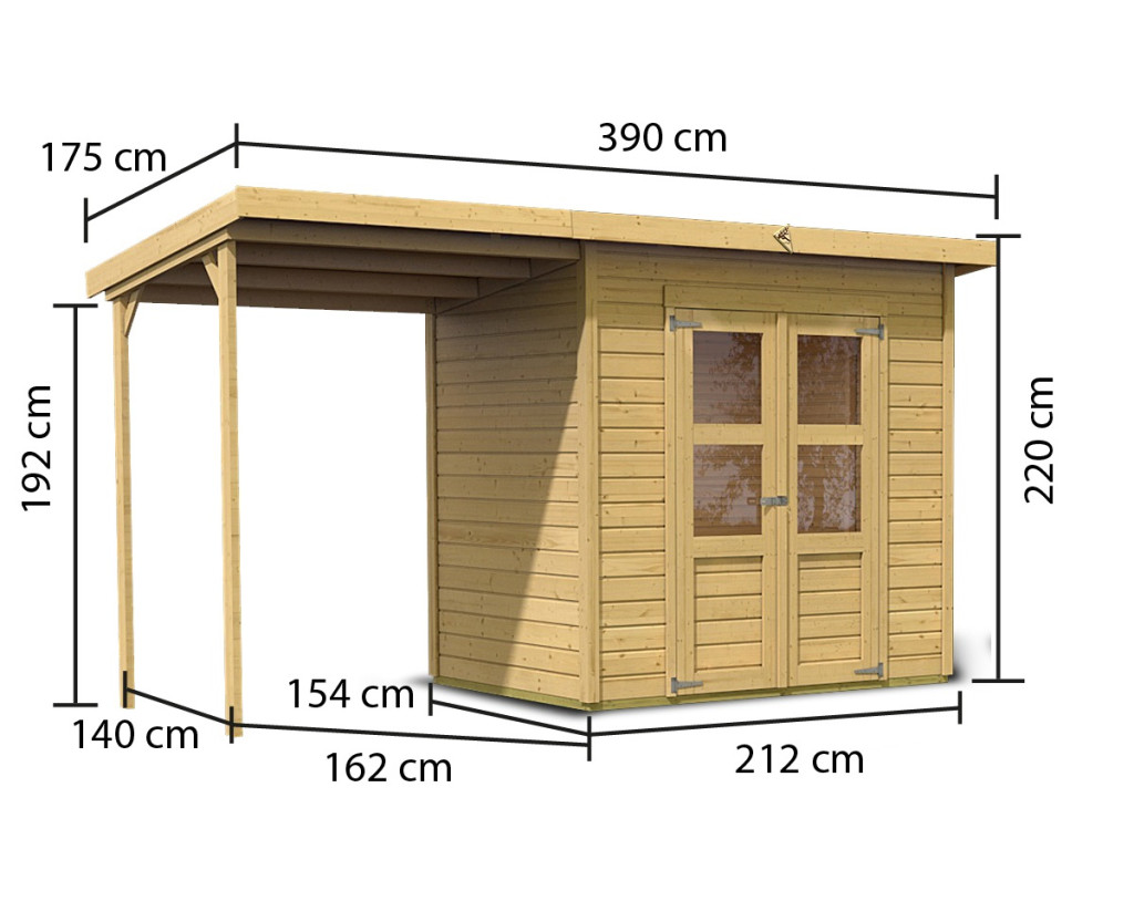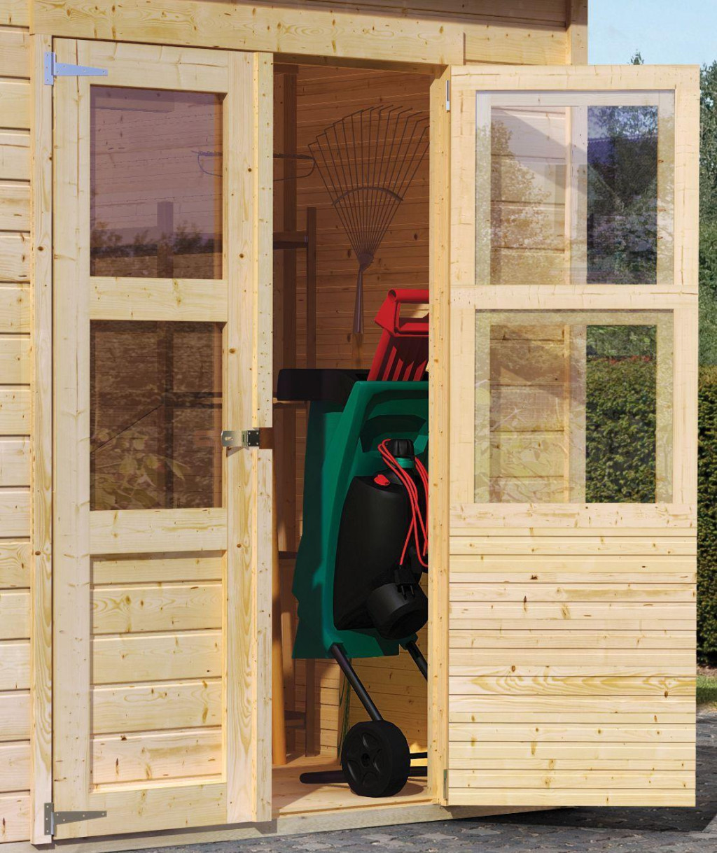 Egy faház alapmodellje kertjébe. Ez a modell lapos tetővel és dupla csuklós ajtókkal rendelkezik, mindkét szárnyban ablakkal.