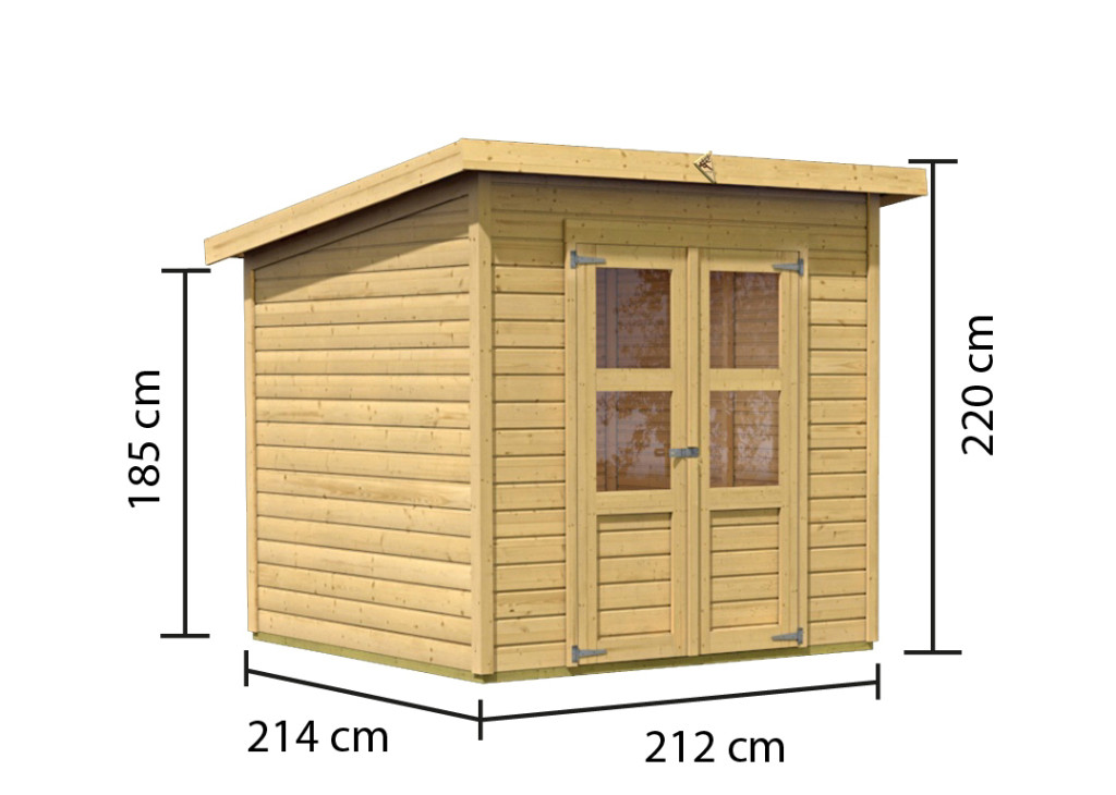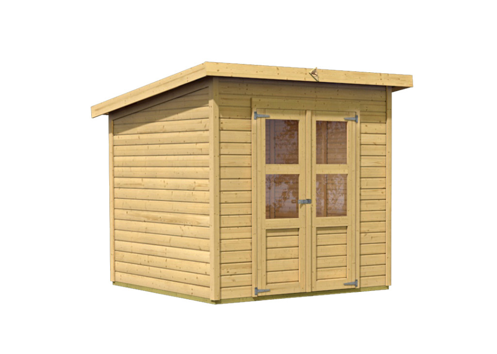 Egy faház alapmodellje kertjébe. Ez a modell lapos tetővel és dupla csuklós ajtókkal rendelkezik, mindkét szárnyban ablakkal.