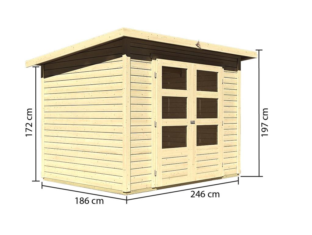 Egy faház alapmodellje kertjébe. Ez a modell lapos tetővel és dupla csuklós ajtókkal rendelkezik, mindkét szárnyban ablakkal.