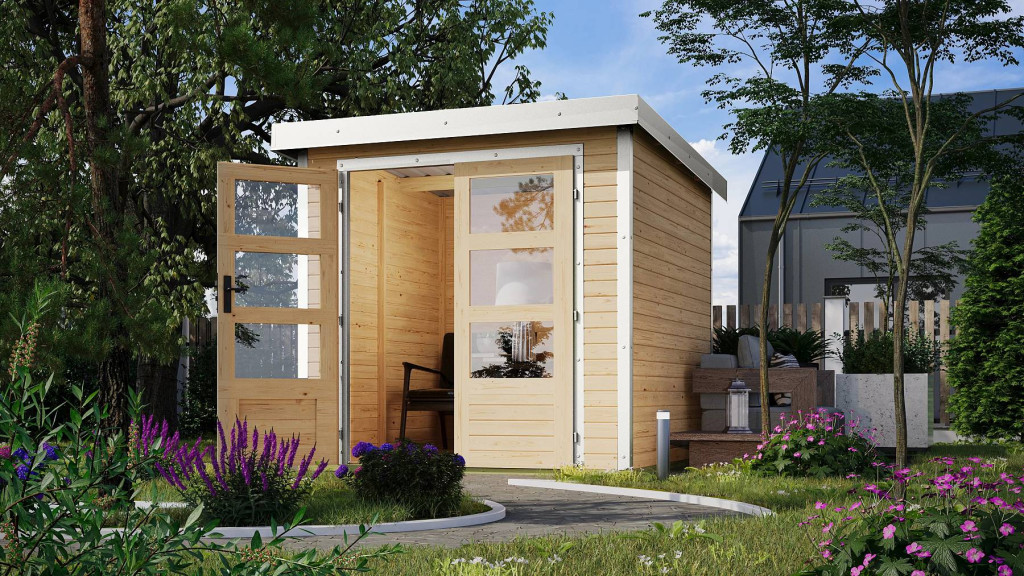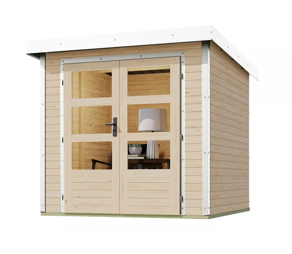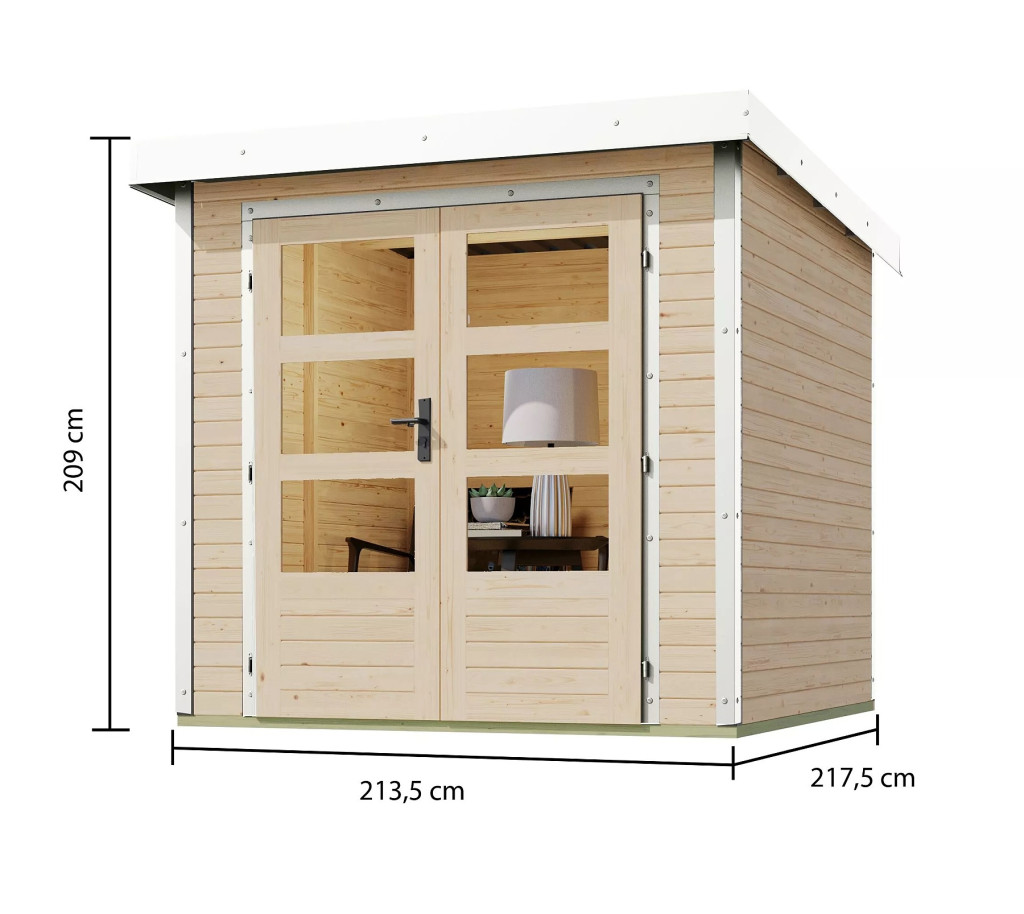 Hibrid kerti ház, falvastagság 19 mm, méretek sz 213,5 x h 217,5 cm, a ház külső területe 4,62 m2 bádogtetővel.