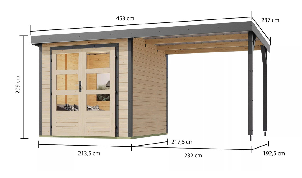 Hibrid kerti ház, falvastagság 19 mm, méretek sz 438 / 213,5 x h 217,5 cm, a ház külső területe 9,50 m2 bádogtetővel.