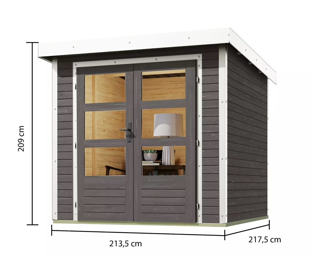 Hibrid kerti ház, falvastagság 19 mm, méretek sz 213,5 x h 217,5 cm, a ház külső területe 4,62 m2 bádogtetővel.
