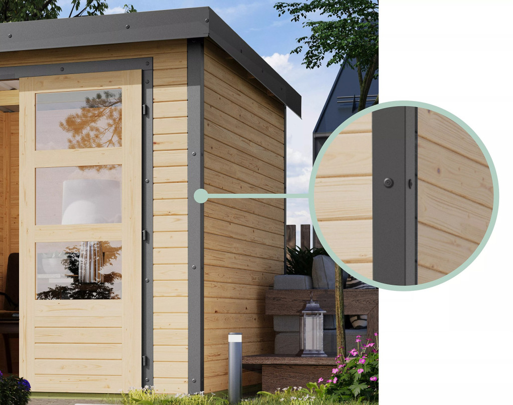 Hibrid kerti ház, falvastagság 19 mm, méretek sz 213,5 x h 217,5 cm, a ház külső területe 4,62 m2 bádogtetővel.
