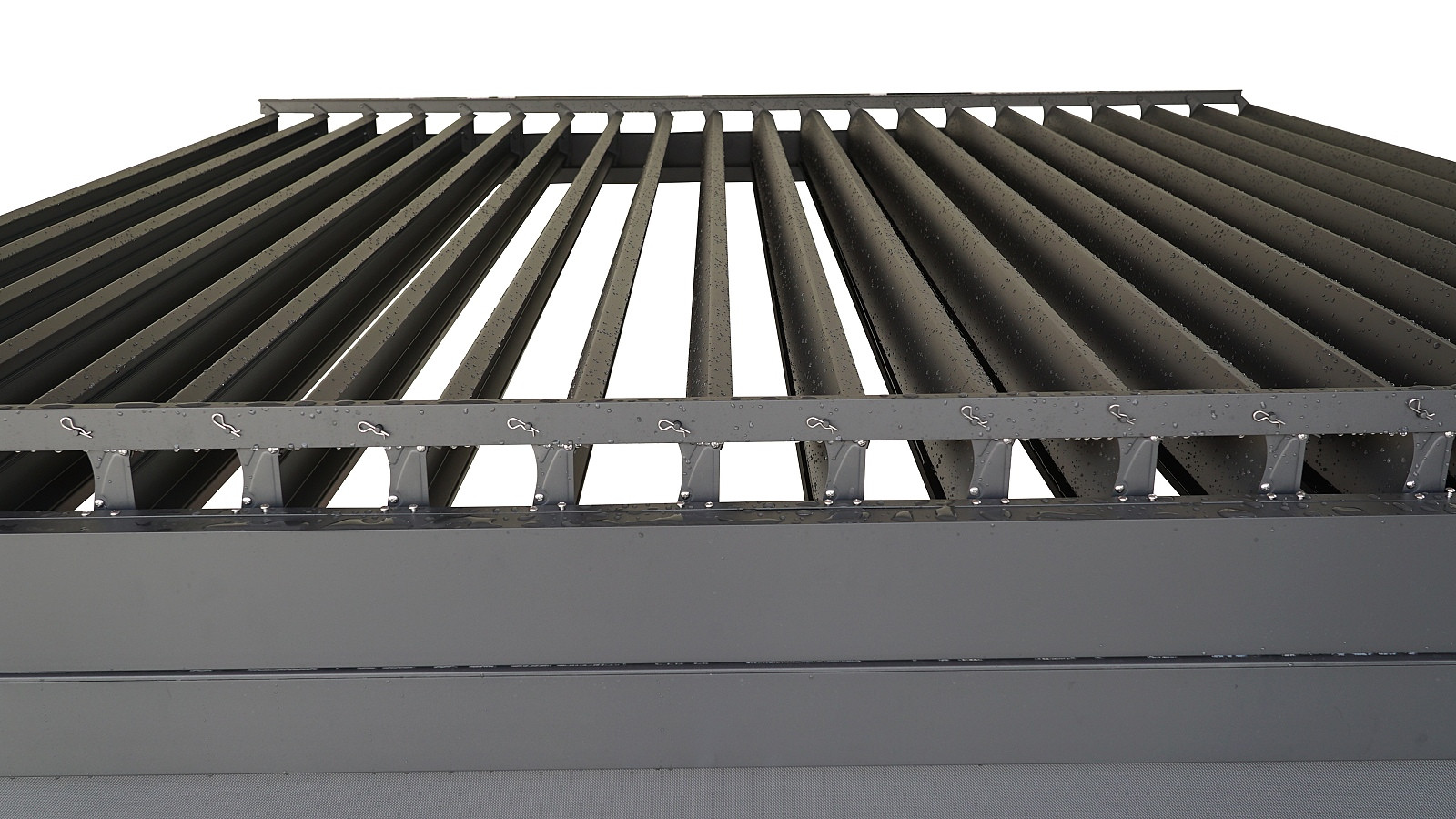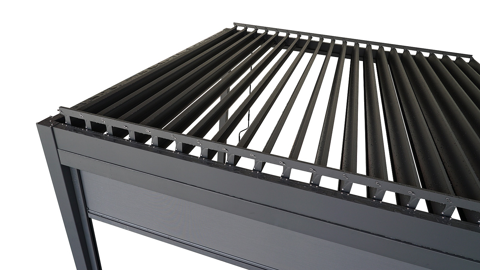 Kerti alumínium pergola lapostetővel és a tetőlécek kézi vezérlésével. A pergolában kellemes kikapcsolódást talál a forró nyári napokon. A tető több tucat forgó lécből áll, és megvédi Önt a rossz időjárástól. A lécek kézzel 0-90o-os szögben forgathatók. Egy kis kézi működtetésű hajtókar vezérli a tetőmechanizmust, a hajtókar forgatásával a lécek szinkronban forognak. A 90o-os elfordulási szög nyitott tetőt, a 0o-os pedig teljesen zárt tetőt biztosít. A léceket is csak elforgatott állapotba lehet állítani, és ezzel szabályozni a pergolán áthatoló napfény mennyiségét. A szerkezet tartós alumíniumötvözetből készült, porfestékkel (komaxit) szórva, így ellenáll a természetes éghajlati hatásoknak.