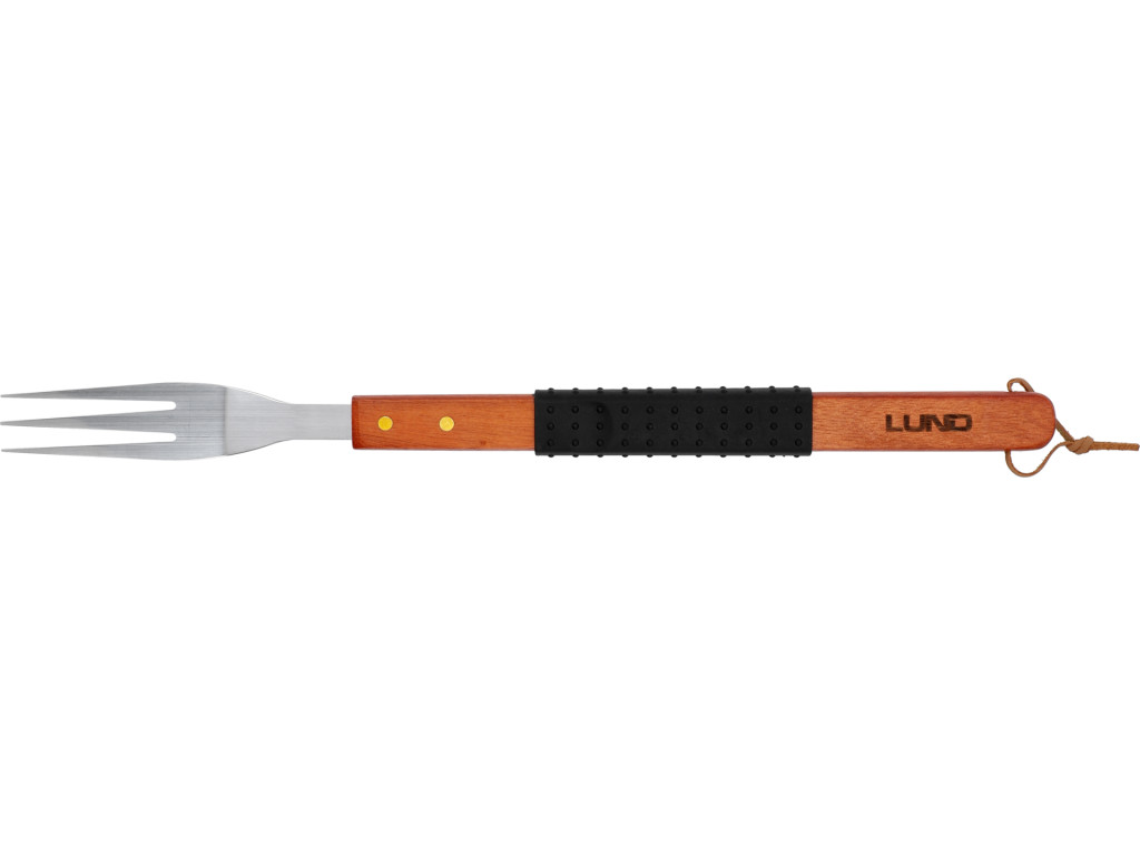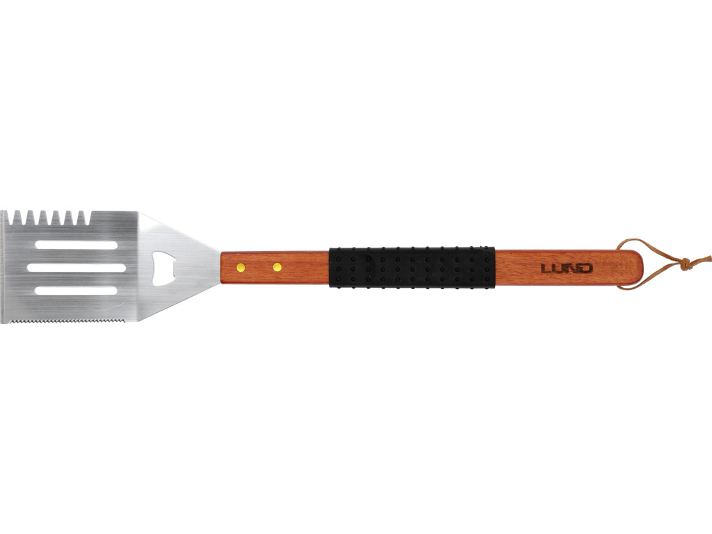 Zestaw profi grillezőeszközök: 430-as rozsdamentes acél munkarész, fa+gumi fogantyú, lemezvastagság 1,5 mm. Villa 51,5×3,6 cm, lapát 52×9 cm, csipesz 45×6,5 cm.