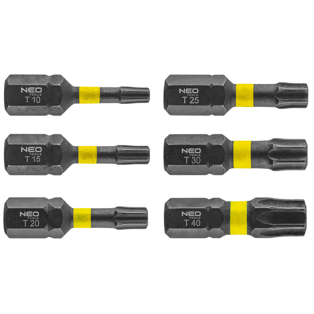 Neo torziós ütvecsavarozó bit T10/15/20/25/30/40x25 mm, 6 részes