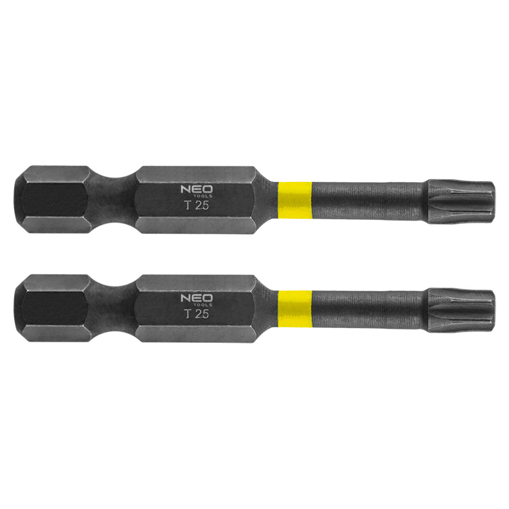 Neo torziós bit ütvecsavarozáshoz T25x50 mm. Nagy teljesítményû bitek, amelyeket nagy nyomatékú csavarbehajtóval vagy ütvecsavarozóval, történő munkavégzéshez terveztek. Kiváló minőségű S2 acélból készül, amelyet fokozott rugalmasság és a mechanikai sérülésekkel szembeni ellenállás jellemzi. A nagy nyomaték hatására forgó torziós zóna csökkenti az erőátadást, ami ellenállóbbá teszi a töréssel szemben, és élettartama lényegesen hosszabb lesz. A hegy csúcspontja tökéletes illeszkedést garantál.