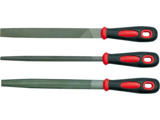 Négyszögletű, félkerek, lapos reszelők, dupla vágással, kétkomponensű műanyag fogantyúval. 200 mm-es