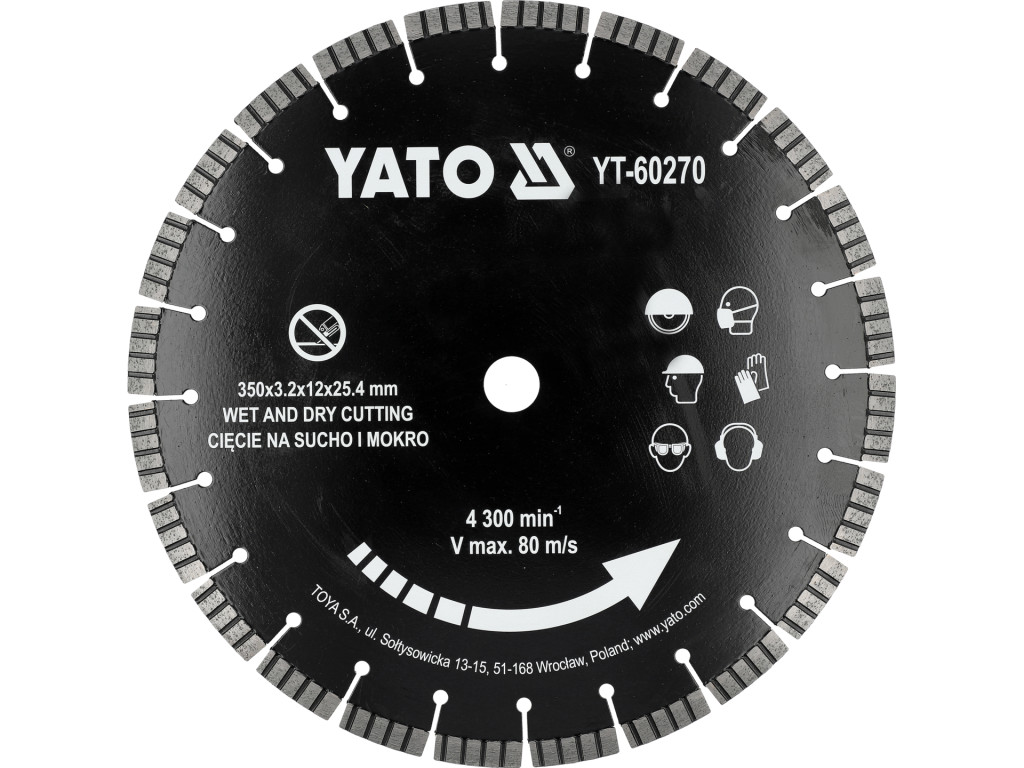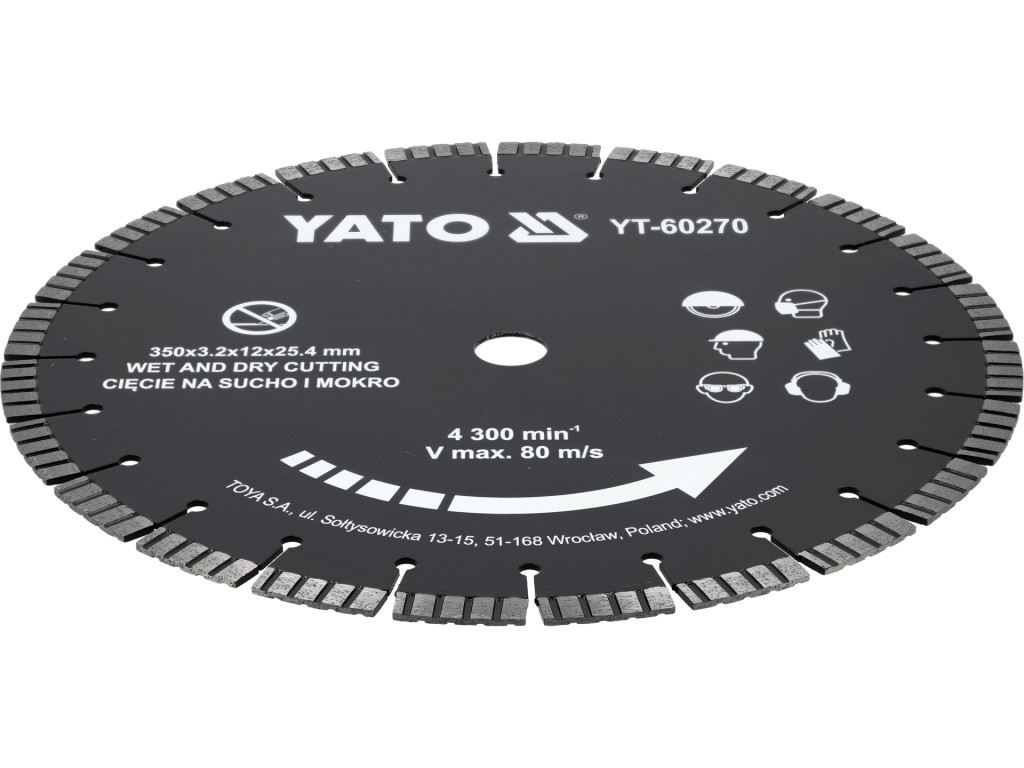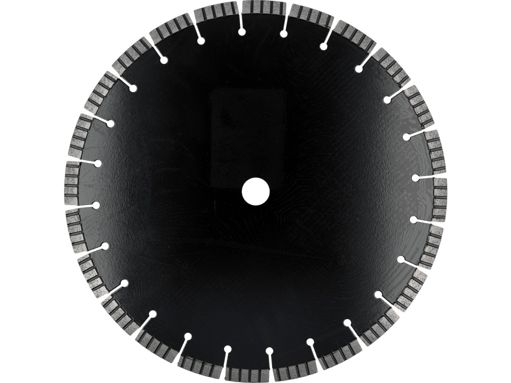 Gyémánt vágókorong száraz és nedves vágáshoz; keményített és megerősített beton, tégla, gránit, fal, kő, homokkő vágására. Ø350 mm, max 80 m/s, max 4300 min-1; furat Ø25,4 mm; szegmens 3,2 mm vastagság, 12 mm magasság; anyaga: 65Mn acél.