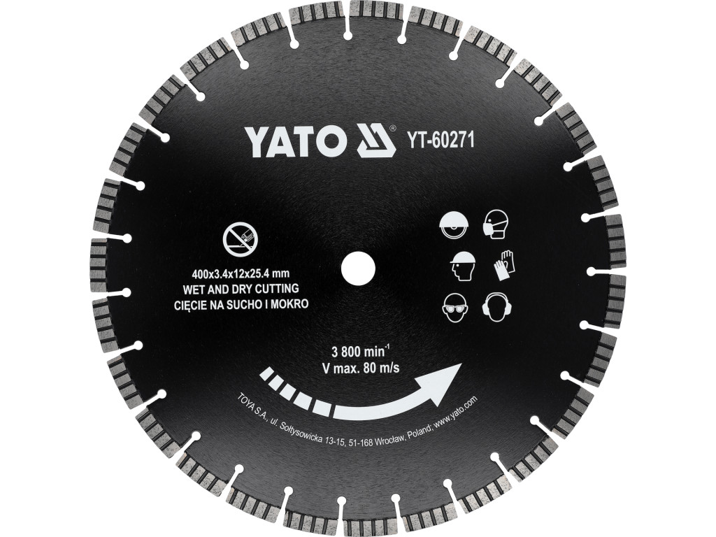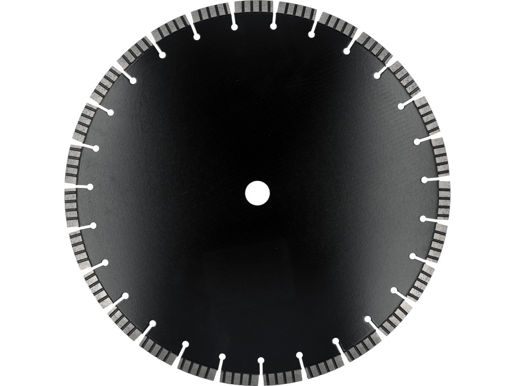 Gyémánt vágó korong száraz/nedves vágáshoz, Ø400 mm; max 80 m/s; max 3800 min-1; befogó Ø25,4 mm; vágó szegmens vastagság 3,4 mm, magasság 12 mm; 65Mn acél; kemény és megerősített beton, tégla, gránit, fal, kő, homokkő.