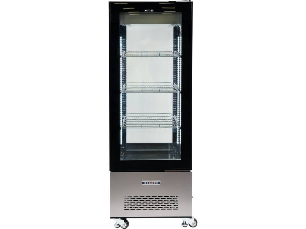 YATO álló hűtővitrin 400L űrtartalommal, fekete színben, 650x650x1908mm méretekkel.