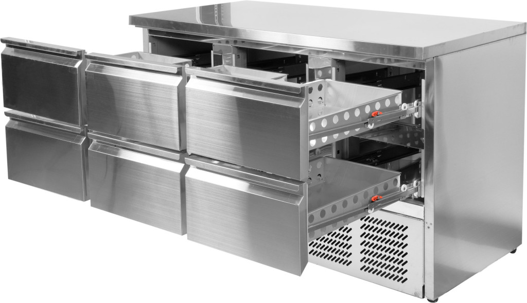 Lehetővé teszik a GN 1/1 méretű , legfeljebb 155 mm magas tartályok és palackok tárolását. A fiókok oldalfalán lévő nyílások szabad levegőáramlást tesznek lehetővé, növelve a hűtési hatékonyságot. A fiókok golyóscsapágyas vezetőkre vannak felszerelve , és speciális kialakításuk lehetővé teszi a mosáshoz való teljes kihúzást és eltávolítást , ami nagyban megkönnyíti a tárolt termékek elérését. A cserélhető mágneses tömítések biztosítják a szoros zárást. A kiváló minőségű SS201 rozsdamentes acélból készült külső és belső burkolat elegáns megjelenést garantál. A belső kamra lekerekített élei nagyon egyszerűvé teszik a tisztán tartást. A 240 W teljesítményű alsó hűtőegység R290 hűtőközeget használ, amely a 4-es klímaosztályban működik , maximum 30℃ környezeti hőmérséklettel és 55%-os relatív páratartalommal. Az átlagos éves energiafogyasztás 1797 kWh . 220-240V ~ 50Hz feszültségről működik . A készülék ventilátoros hűtéssel és automatikus leolvasztó funkcióval rendelkezik. Dixell elektronikus vezérlő digitális hőmérséklet kijelzővel.