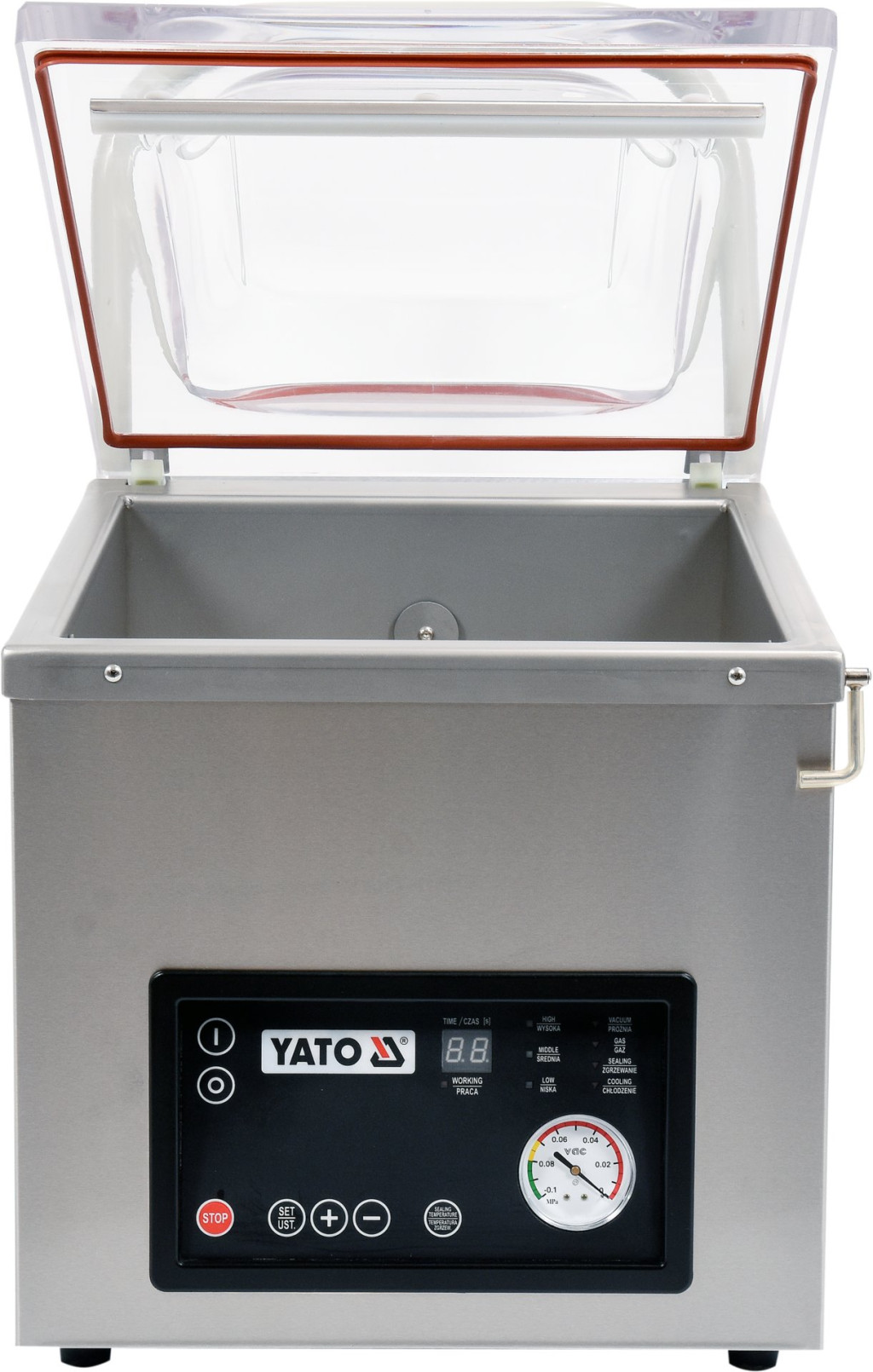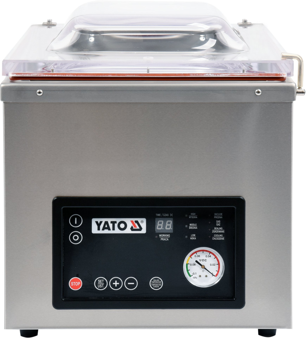 A kamrás vákuumcsomagoló gép nagyon hasznos eszköz minden vendéglátó egységben. Lehetővé teszi az élelmiszerek vákuumcsomagolását, amely oxigén nélkül sokkal tovább friss marad. Az így becsomagolt termékek a hűtőszekrényben-fagyasztóban nagyon hosszú ideig tárolhatók. A legjobb minőségű, akár 20m3/h kapacitású szivattyú és az akár 350 mm széles tömítőrúd lehetővé teszi még nagy zsákok nagyon gyors bepakolását is. A teljesen automatikus csomagolási folyamat és a lezárási idő beállításának lehetősége sokkal könnyebbé és gyorsabbá teszi a munkát. A beépített digitális kijelző és nyomásjelző azonban jól látható, és teljes ellenőrzést biztosít a teljes csomagolási folyamat felett. A YATO márkájú vákuumcsomagoló gép a legjobb minőségű alapanyagokból készül. A 450x370x170 (220) mm méretű vákuumkamra vastag és masszív rozsdamentes acélból készül, ami nagyon hosszú élettartamot garantál. A lekerekített formák megkönnyítik a tisztán tartást. A csomagológép burkolata nagyon tömör műanyagból készült, átlátszó színben. Ez lehetővé teszi a csomagolási folyamat nyomon követését és teljes ellenőrzését. Ezenkívül a fedélnek van egy bemélyedése, amely 170 mm-ről 220 mm-re növeli a kamra magasságát, lehetővé téve nagyobb termékek csomagolását. A 560x425x490 mm külső méretű YATO állítható csomagológép súlya 58 kg, így bárhol elhelyezhető. A készülék teljesítménye 900W, tápellátása pedig 230V ~ 50Hz.