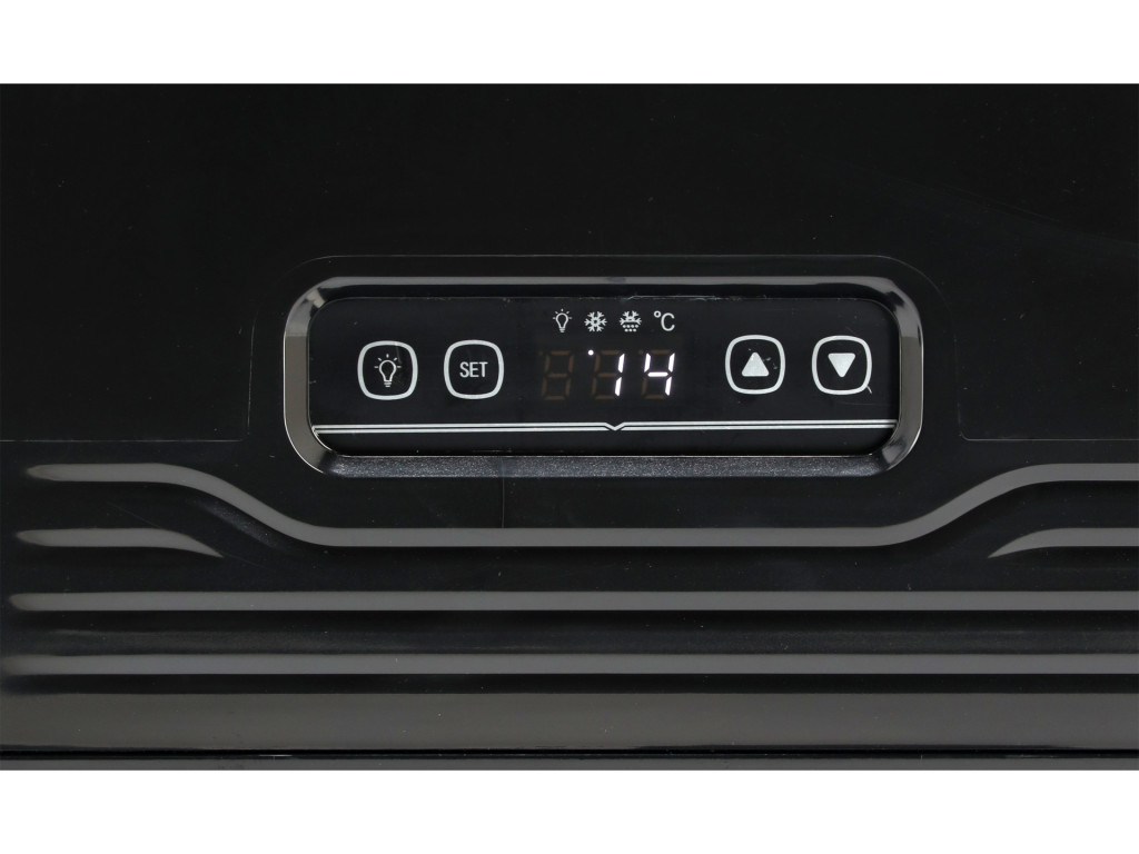 Fekete rozsdamentes acél üvegvitrin bemutató hűtő 69 L, 0–12 °C, 1 ajtó, 3 polc, dupla edzett üveg, LED világítás 2×2 W, automatikus leolvasztás, 220–240 V AC, R290.