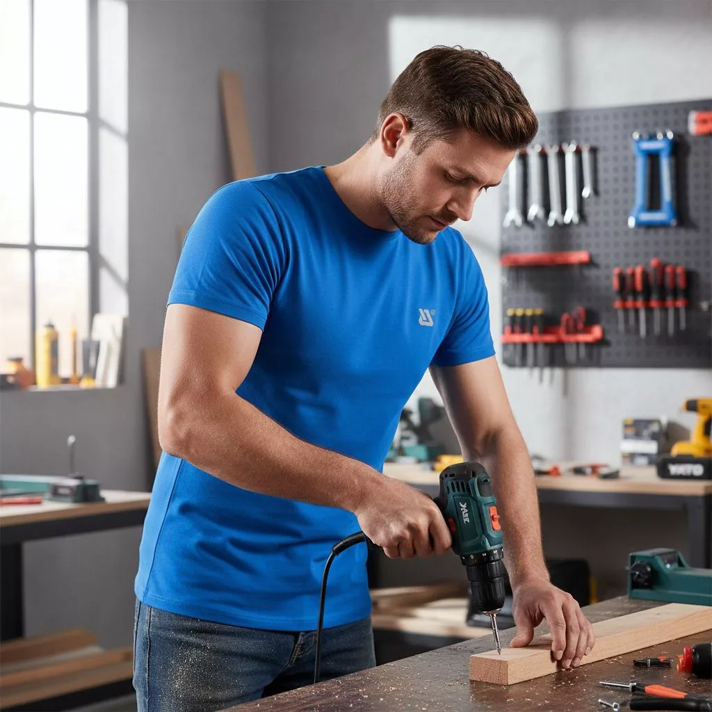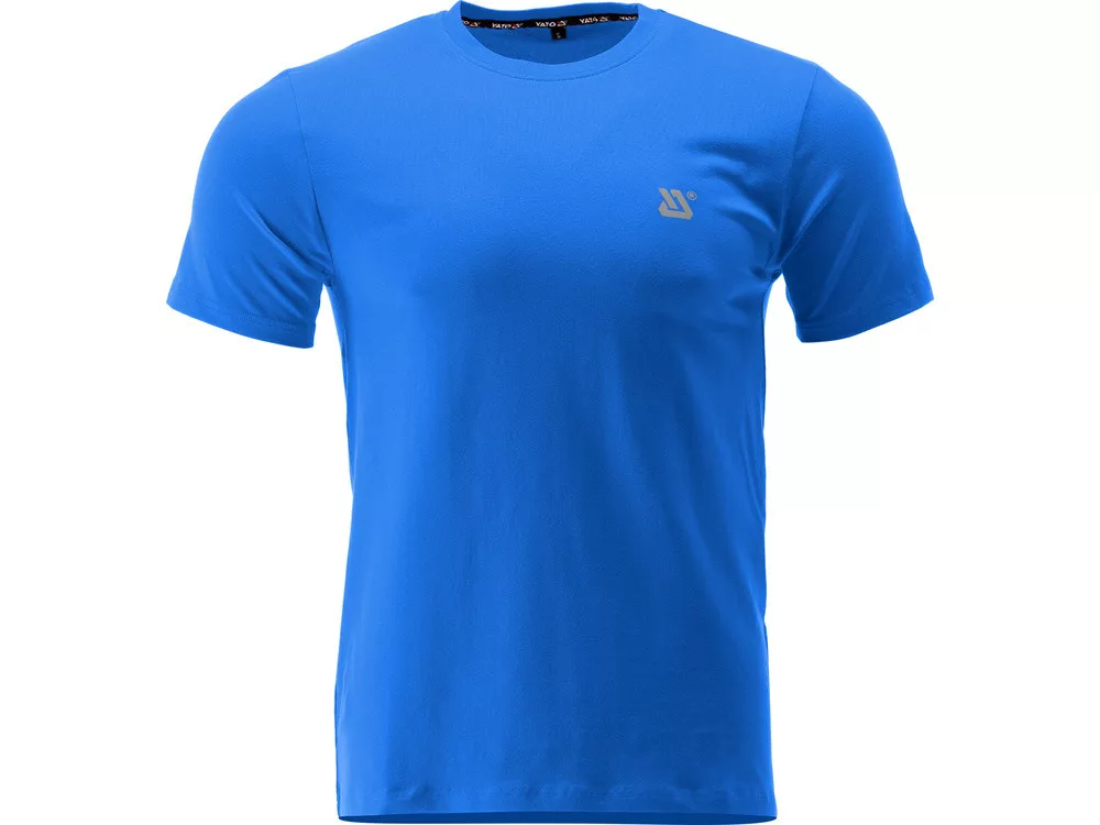 Környakas elasztikus póló, nem korlátozza a mozgást, tartós és megbízható overlock varratokkal, kék színű.