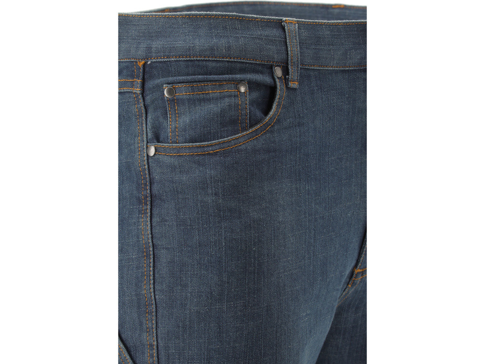 Munkavédelmi farmernadrág, poliészterrel és elasztánnal, dupla varrással,10 zsebbel.