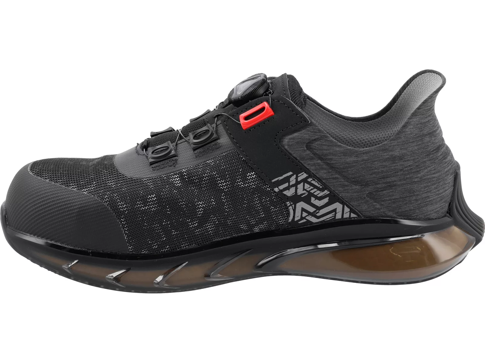 Innovatív, három anyagból álló talp. A külső, részben átlátszó TPU-rész esztétikai előnyökön túl légpárnát képez a szinte teljes kerületén. Megnöveli a kényelmet a nem szabványos pozíciókban végzett munka során. A belső, responszív ETPU egészben tartja a lábat, kiválóan tompítja a rezgéseket. A csúszásmentes gumifelület stabilitást biztosít olyan felületeken is, amelyeket mosószerekkel és olajos anyagokkal kezelnek, amit az SR-tanúsítvány igazol. A használati kényelmet tovább fokozza a popcorn designú, innovatív belsőbetét.