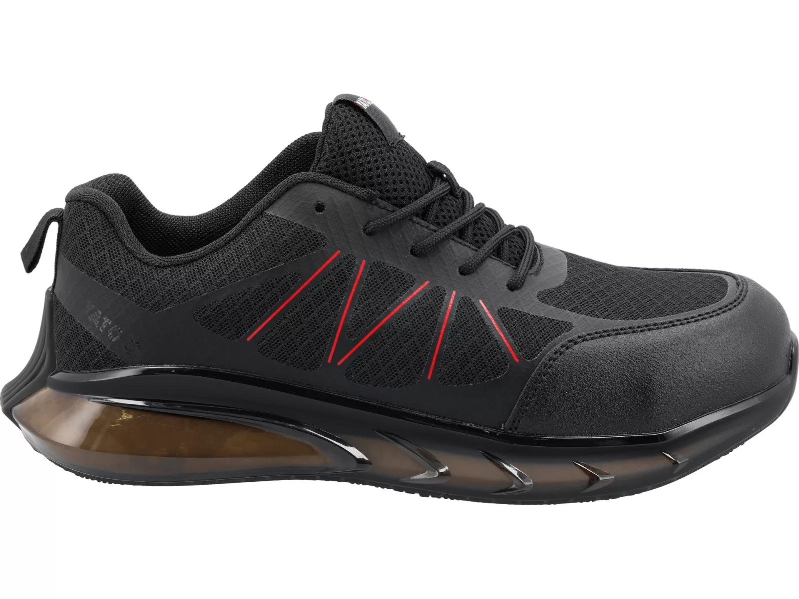 Könnyű PILSEN S1 PL félcipő: ütésálló műanyag orr, rugalmas anti-perforációs betét, golyóálló mellényekhez használt anyagból, háromanyagú talp TPU/ETPU, csúszás- és olajálló, SR és EN 20345.
