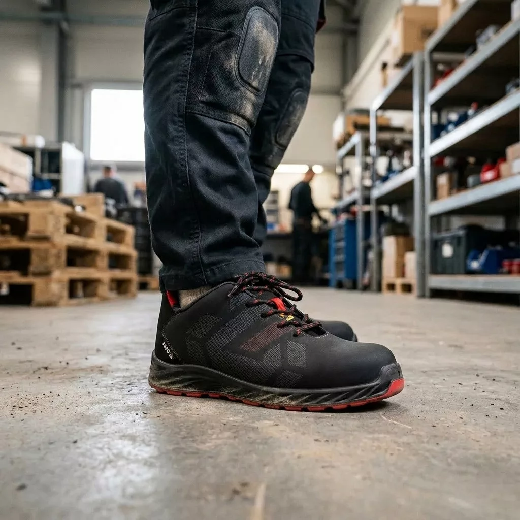 Munkavédelmi félcipő, ütésálló üvegszálas orrmerevítővel, legújabb generációs szintetikus bőrből, rugalmas, átszúrásbiztos betéttel ellátott.