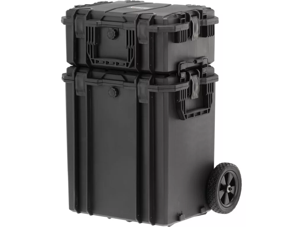 Készlet: YT-08890 & YT-08895, PP, falvastag 10 mm, külső 465×355×205 és 465×355×512 mm, belső 410×305×185 és 400×320×500 mm, habbetét, kerekek, dekompressziós szelep, zárható csatok, IP67/IP55