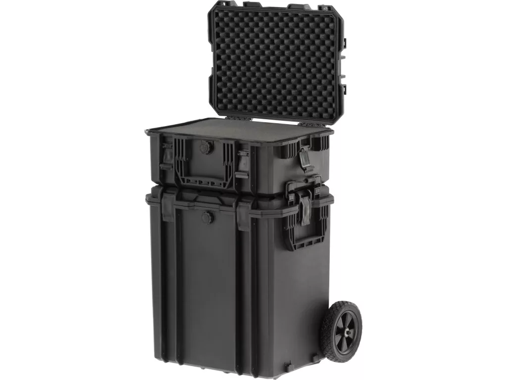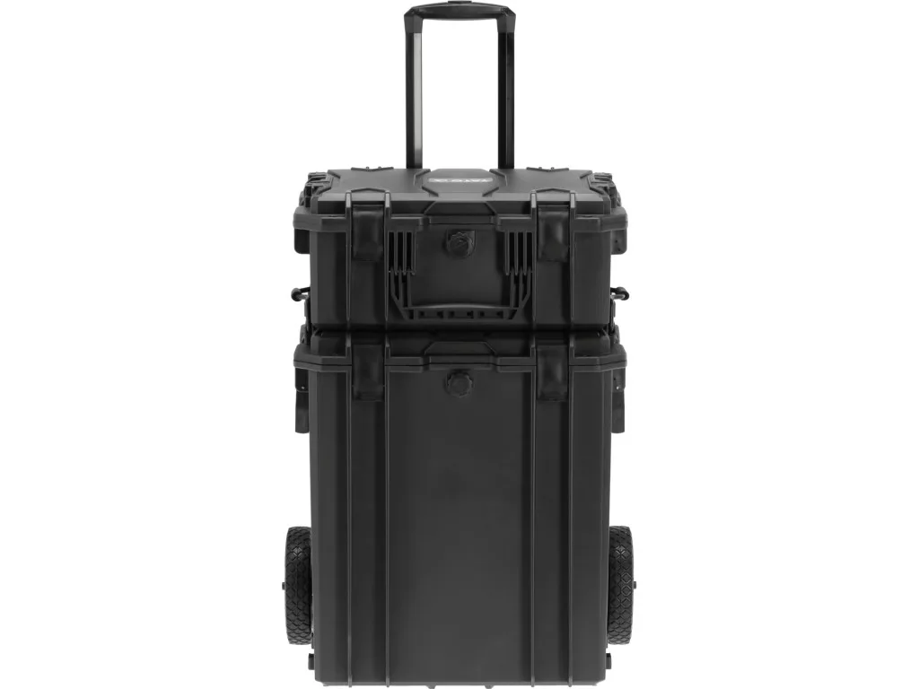 Víz- és porálló kivitel, ellenáll a külső hatásoknak, rázkódásoknak, mechanikai sérüléseknek és korróziónak, valamint egyes vegyi anyagok hatásának is. Hatékony tömítőrendszerrel rendelkeznek, kiegészítve egy dekompressziós szeleppel, amely a légiszállítás során a nyomáskiegyenlítést szolgálja. Kerekekkel ellátva mobil, nagy tárolófelületű szettet alkotnak. Műszaki polipropilénből készülnek. Habbetét elővágott mélyedésekkel, előkészítve az egyedi formájú mélyedések önálló kialakításához például szerszámok, mérőeszközök, fotós felszerelés vagy elektronika számára. Hermetikus fedők csatokkal záródnak; nyílások lehetővé teszik további lakatok felszerelését. Kényelmes hordfogantyúk és kihúzható kéziszár segítik a kézreálló szállítást. Vízállósági osztályok: IP67 és IP55. Biztos és megbízható rögzítés mindkét bőrönd számára. Külső méretek: 465 x 355 x 205 mm és 465 x 355 x 512 mm; belső méretek: 410 x 305 x 185 mm és 400 x 320 x 500 mm. Falvastagság: 10 mm.